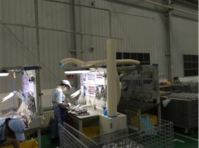 解决方案:使用公司SPC-407工业冷气机机型,排热管延长至2M,冷风管延长至3M并加装Y型三通,一台机器供两个工位使用。